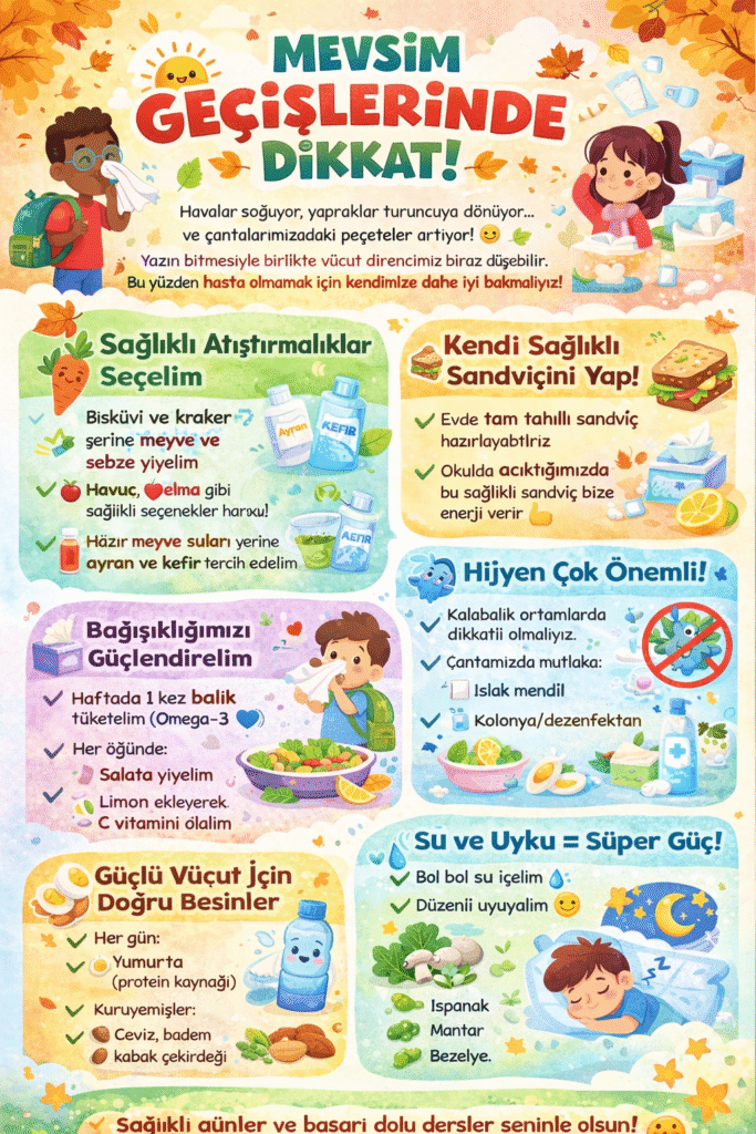 Yaz mevsiminin bitişiyle birlikte havalardaki sıcaklık düştüğü için vücut direncimiz de azaldı ve bu da bizleri hastalıklara daha kolay yakalanır hale getirdi. İşte tam bunlardan dolayı mevsim geçişlerinde, beslenmemize ekstra dikkat etmeliyiz. Beslenme çantalarımızda bisküvi ve krakerler yerine meyvelere ve sebzelere yer verebiliriz. Örneğin çıtır çıtır yenilen bir havuç 🥕 ya da lezzetli bir elma 🍎 harika bir seçenek olur.